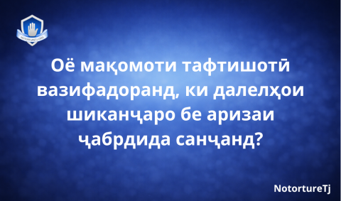 ПОСУХ: Бале, мақомоти тафтишотӣ вазифадоранд, ки далелҳои шиканҷаро санҷанд ва тафтиш кунанд, агар онҳо аз ВАО, шаҳодаткунонии тиббӣ, судҳо, адвокатҳо, хешовандон ё дигар манбаъҳо маълум шуда бошанд, чунин меъёр дар қонунгузории Тоҷикистон, аз ҷумла Конститутсияи ҶТ (м. 18), КҶ (м. 143(1)), КМҶ (м. 21 ва м. 145-146) пешбинӣ гардидааст. Аммо, ниҳоде, ки барои санҷиши содир шудани ҷинояти моддаи 143, эзоҳи 1 КҶ ҶТ ваколатдор гардидааст, прокуратура ба шумор меравад.