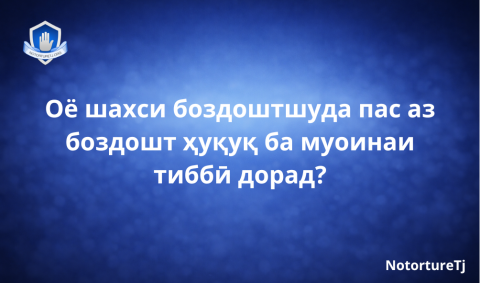 ПОСУХ: Бале, шахси боздоштшуда пас аз боздошт фавран ҳуқуқ ба муоина ва ёрии тиббӣ дорад (м. 46, м. 94 КМҶ ҶТ, м. 20 Қонуни ҶТ «Дар бораи ҳифзи саломатии аҳолӣ»).