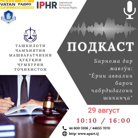 Ташкилоти ҷамъиятии «Машваратчиёнии хукукии Ҷумҳурии Тоҷикистон» дар доираи лоиҳаи «Машваратчиёни халқӣ зидди шиканҷа - 2!», ки аз ҷониби IPHR маблаггузори карда мешавад, ҳадафаш барои мусоидат ба иштироки фаъолонаи Институти машваратчиёни халқӣ дар ҷараёни мурофиаи судӣ равона карда шудааст, радио барномаеро дар мавзуи “Ёрии аввалин барои ҷабрдидагони шиканҷа” тариқи Радио “Ватан” сабт ва пахш намуд.