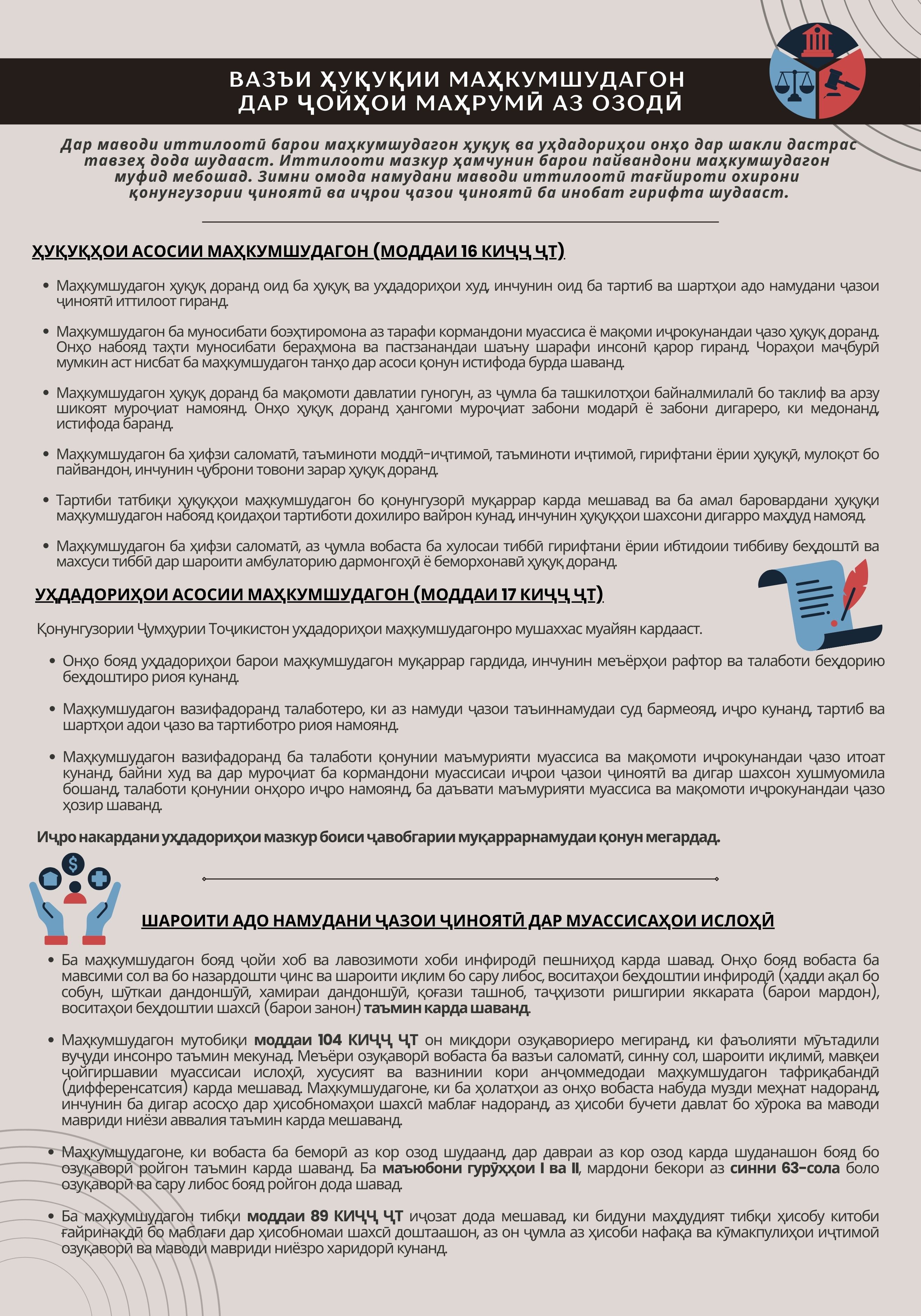 Ин плакати иттилоотӣ дар доираи Стратегияи қабулшудаи ислоҳоти низоми ҷазои ҷиноии Ҷумҳурии Тоҷикистон то соли 2030 ва бо дастгирии молиявии Ҳукумати Швейтсария дар Тоҷикистон (SDC) ва Хазинаи демократияи СММ (UNDEF) таҳия шудааст.
