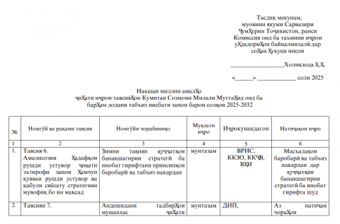 Нақшаи миллии амалҳо ҷиҳати иҷрои тавсияҳои Кумитаи Созмони Милали Муттаҳид оид ба барҳам додани табъиз нисбати занон барои солҳои 2025-2032