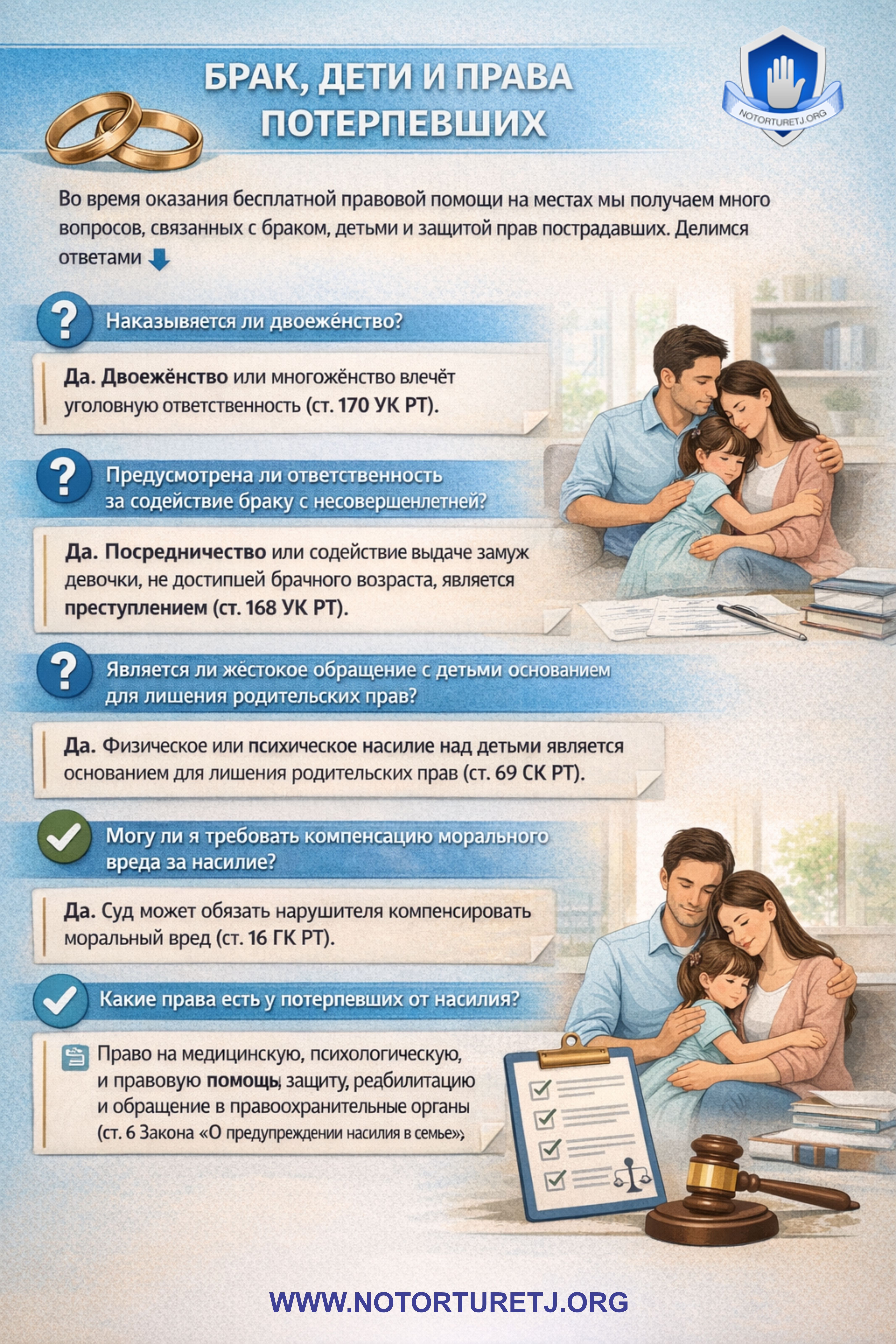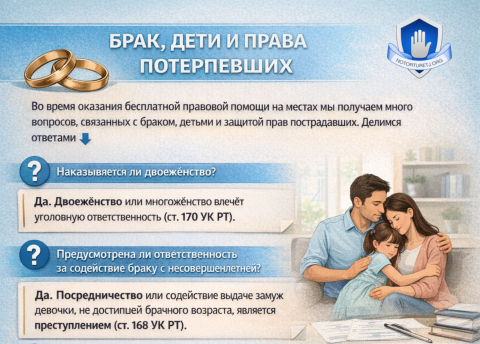 Во время оказания бесплатной правовой помощи на местах мы получаем много вопросов, связанных с браком, детьми и защитой прав пострадавших.