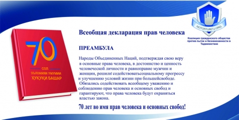 Коалиция гражданского общества против пыток и безнаказанности в Таджикистане проводит ряд мероприятий, посвященных 70-летию принятия Всемирной декларации прав человека и Международному дню защиты прав человека.