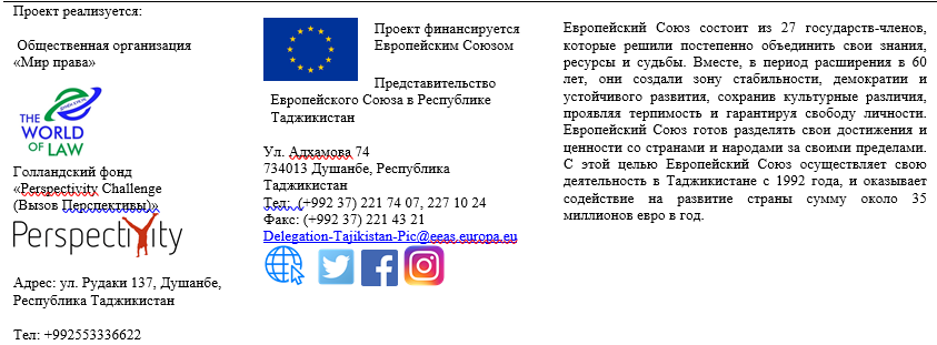 Для получения дополнительной информации свяжитесь с менеджером по связям с общественностью «Мир права», Файзуллоева Сулхия по электронной почте: world.law.tj@gmail.com