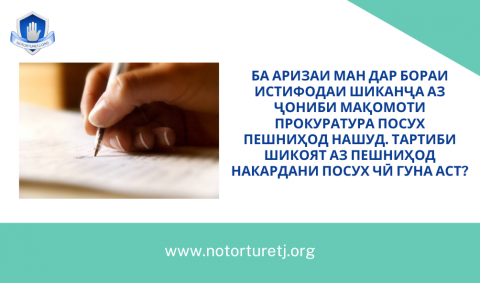 САВОЛ: Ба аризаи ман дар бораи истифодаи шиканҷа аз ҷониби мақомоти прокуратура посух пешниҳод нашуд. Тартиби шикоят аз пешниҳод накардани посух чӣ гуна аст?